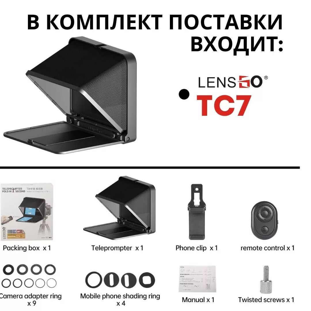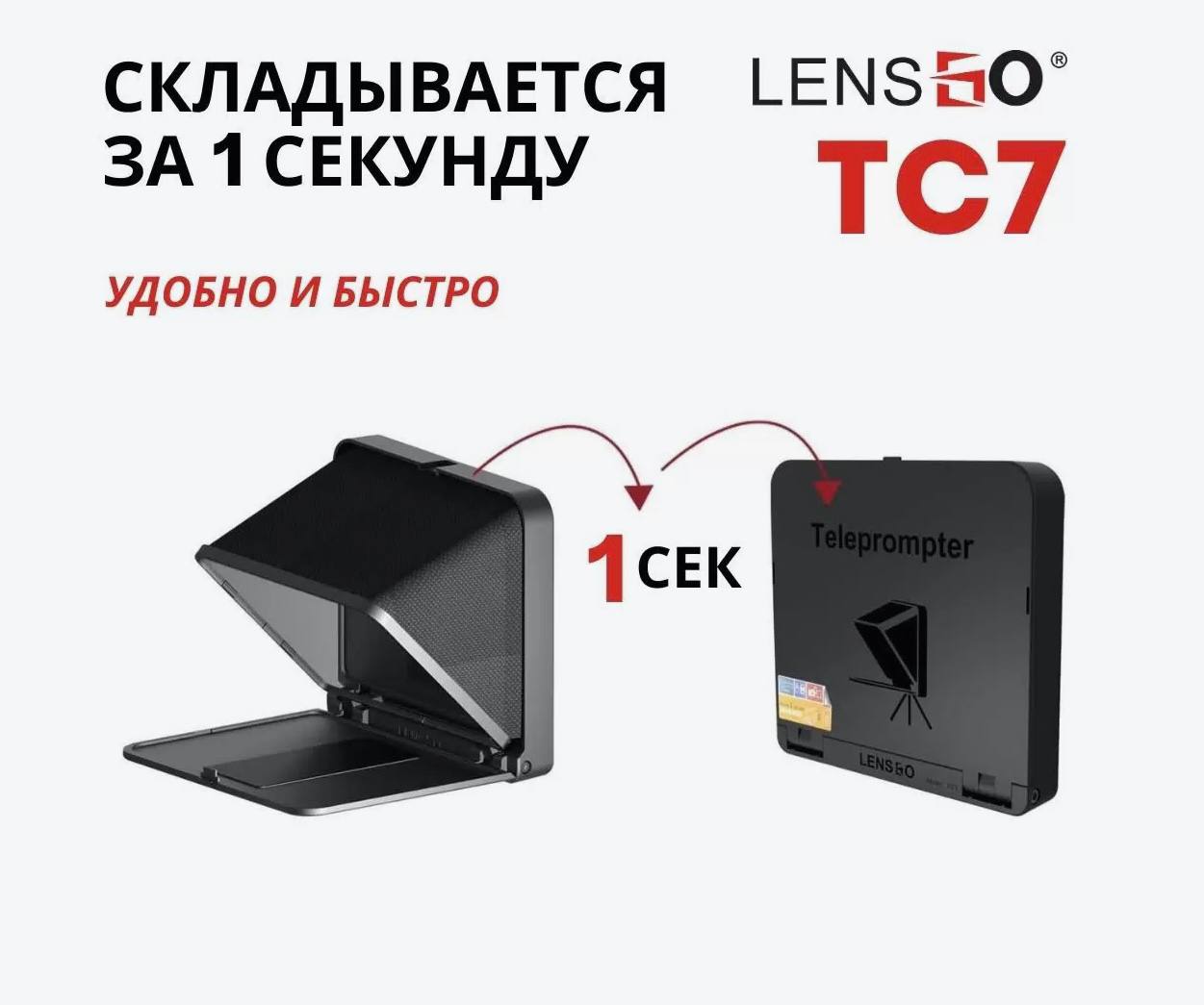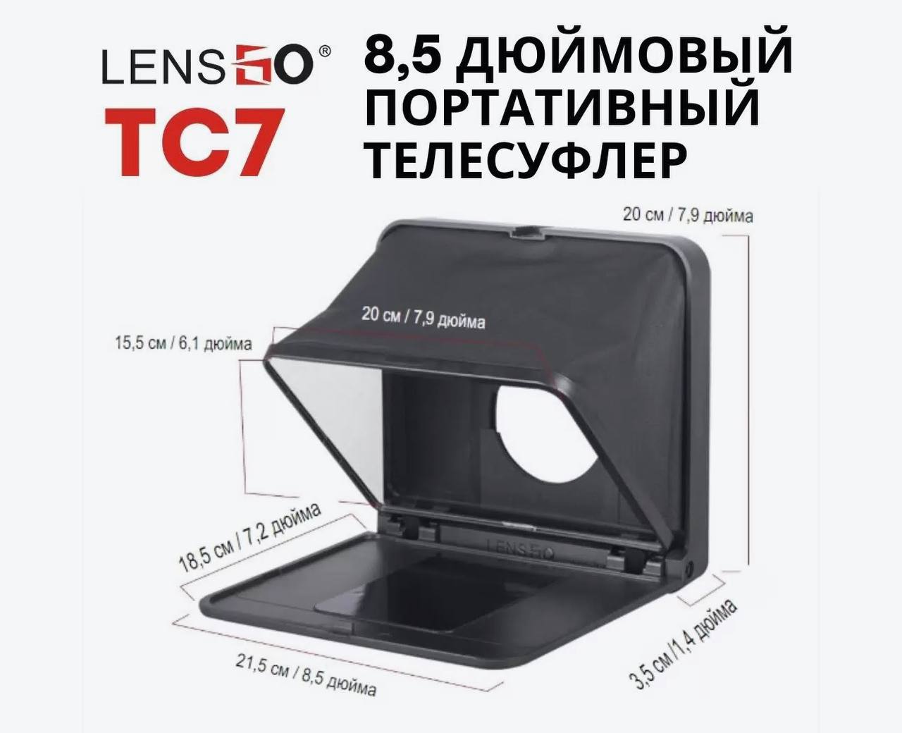 Телесуфлер LensGo TC7 отличается по размеру и конструкции, модель обладает мобильностью и легкостью в использовании, что делает производство качественного контента еще проще.
